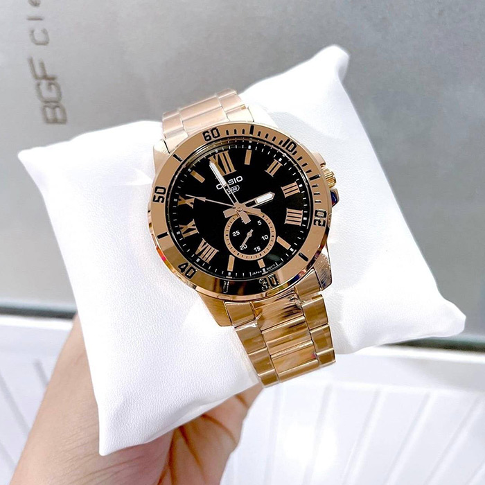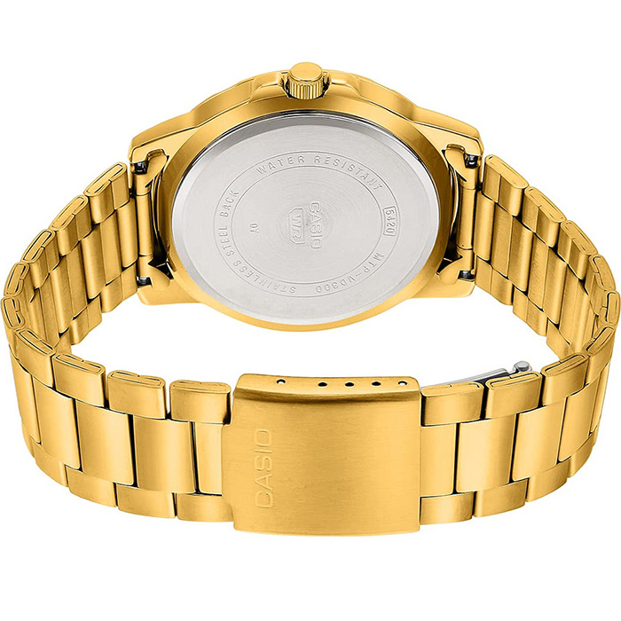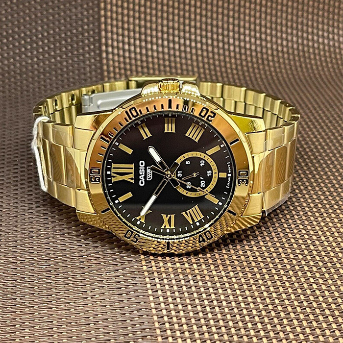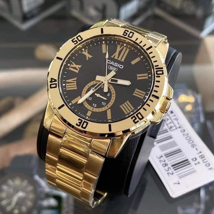 Мужские кварцевые наручные часы Casio MTP-VD200G-1B. Калибр механизма — 5614. На данной модели отображается текущая дата. Стрелки покрыты люминесцентным напылением (светятся в темноте). Стальной браслет. На корпус и браслет нанесено стойкое покрытие. Водонепроницаемость WR (3 атм). Размеры корпуса: (ШхВхТ) 45x49x8.7 мм Гарантийный срок — 3 года (1 год от производителя + 2 года от магазина).