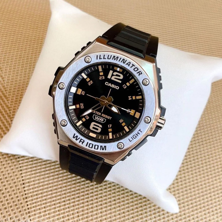 Мужские кварцевые наручные часы Casio MWA-100H-1A2. Калибр механизма — 5577. Диодная подсветка циферблата. Стрелки покрыты люминесцентным напылением (светятся в темноте). Полимерный ремешок. Водонепроницаемость WR100 (10 атм). Размеры корпуса: (ШхВхТ) 49.6x50.6x13.5 мм Гарантийный срок — 3 года (1 год от производителя + 2 года от магазина).