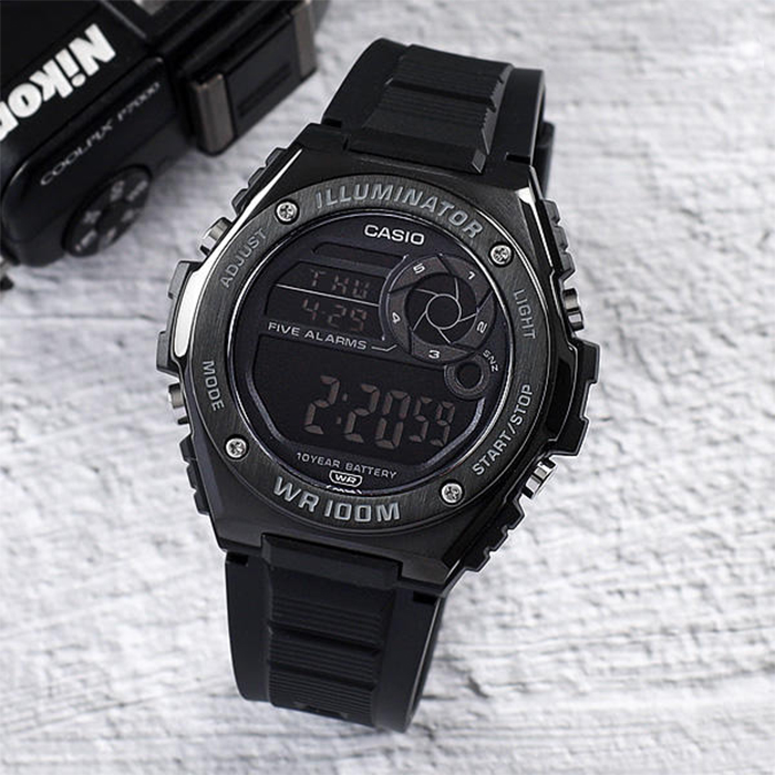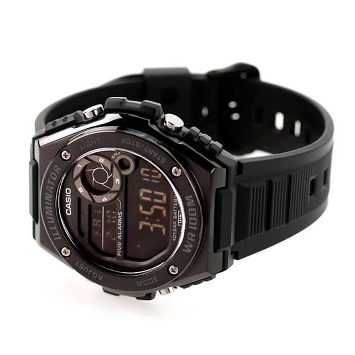 Электронные кварцевые мужские наручные часы Casio MWD-100HB-1B с цифровой индикацией времени. Калибр механизма — 3487. Функциональность данной модели: формат времени 12/24; двойное время; автоматический календарь до 2099 года; 5 независимых будильников; сигнал начала часа; секундомер с точностью 1/100 секунды и измерением до 23 часов 59 минут 59,99 cек.; таймер обратного отсчета (диапазон времени 24 часа) с шагом 1 сек.; диодная подсветка циферблата с функцией послесвечения. На стальную часть корпуса нанесено стойкое PVD покрытие. Инверсный дисплей. Батарейка на 10 лет работы. Водонепроницаемость WR100 (10 атм). Размеры корпуса: (ШxВxТ) 50.7x51.8x13.7 мм. Гарантийный срок — 3 года (1 год от производителя + 2 года от магазина).