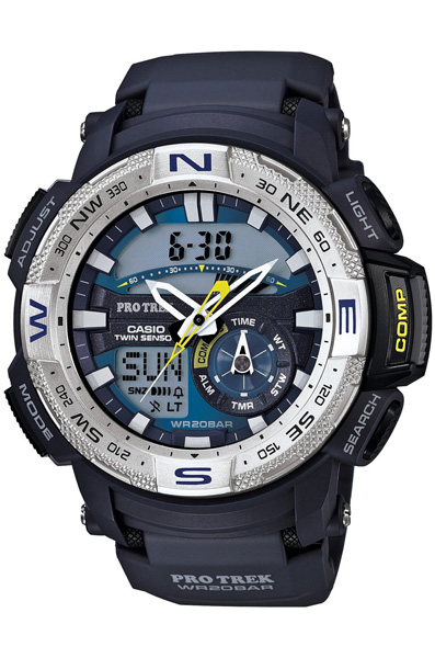 Многофункциональные наручные часы с компасом и термометром Casio PRG-280-2E коллекции Pro Trek. Калибр механизма — 5415. Функциональность данной модели: цифровой компас, записная книжка компаса, термометр, формат времени 12/24, функция летнего времени (DST), мировое время 48 городов (31 часовой пояс), автоматический календарь до 2099 года, 5 независимых будильников, сигнал начала часа, секундомер с точностью 1/100 секунды и измерением до 59 минут 59,99 cек., таймер обратного отсчета (диапазон времени 100 часов), диодная подсветка циферблата с функцией авто (включается при наклоне часов на 40°), функция выключения звука кнопок (Mute). Вращающийся безель. Водонепроницаемость WR200 (20 атм).