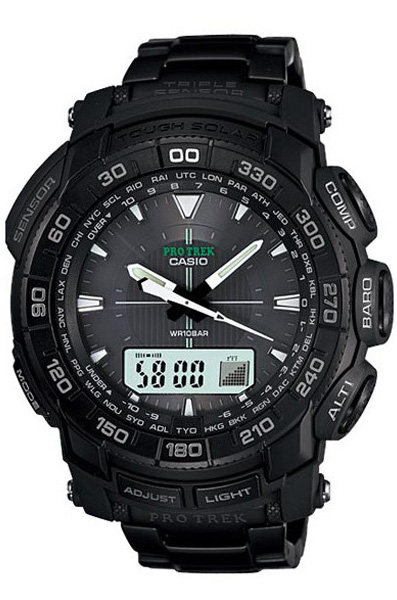 Многофункциональные наручные часы с компасом, термометром, барометром и высотомером Casio PRG-550BD-1E коллекции Pro Trek на солнечной батарее. Калибр механизма — 5213. Функциональность данной модели: цифровой компас, высотомер с записью данных (14 записей), барометр с графиком атмосферного давления (измерения каждые 2 часа), термометр, режим сохранения энергии, индикатор заряда батареи, формат времени 12/24, функция летнего времени (DST), мировое время 29 городов (29 часовых поясов), автоматический календарь до 2099 года, 5 независимых будильников, сигнал начала часа, секундомер с точностью 1/100 секунды и измерением до 59 минут 59,99 cек., таймер обратного отсчета (диапазон времени 60 минут), диодная подсветка циферблата с функцией авто (включается при наклоне часов на 40°), функция выключения звука кнопок (Mute). Водонепроницаемость WR100 (10 атм).