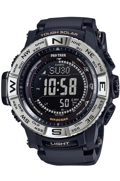Многофункциональные наручные часы с компасом, термометром, барометром и высотомером Casio PRW-3510-1E коллекции Pro Trek на солнечной батарее. Калибр механизма — 3444. Функциональность данной модели: радиоконтроль точного времени (Wave Ceptor), просмотр времени восхода/заката солнца, цифровой компас, записная книжка компаса, высотомер с записью данных (14 записей), барометр с графиком атмосферного давления (измерения каждые 2 часа), термометр, режим сохранения энергии, индикатор заряда батареи, формат времени 12/24, функция летнего времени (DST), мировое время 48 городов (31 часовой пояс), автоматический календарь до 2099 года, 5 независимых будильников, сигнал начала часа, секундомер с точностью 1/10 секунды и измерением до 999 часов 59 минут 59,99 cек., таймер обратного отсчета (диапазон времени 24 часа), электролюминесцентная подсветка циферблата с функцией авто (полная автоподсветка, включается только в темноте при наклоне часов на 40°), функция выключения звука кнопок (Mute). Вращающийся безель. Водонепроницаемость WR200 (20 атм).