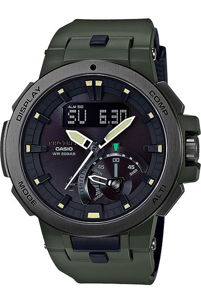 Многофункциональные наручные часы с компасом, термометром, барометром и высотомером Casio PRW-7000-3E коллекции Pro Trek на солнечной батарее. Калибр механизма — 5480. Технология Smart Access, удобная заводная головка, которая ускоряет процесс настройки необходимых функций. Функциональность данной модели: радиоконтроль точного времени (Wave Ceptor), компас, барометр c построением графика атмосферного давления (измерения каждые 30 минут или 2 часа), цифровой компас, альтиметр с памятью на 30 записей (в памяти может быть сохранено до 30 записей, содержащих информацию о дате/времени, направлении, атмосферном давлении, высоте, температуре) диапазон измерения: –700 – 10 000 м., термометр (диапазон измерения и отображения: –10,0–60,0°C), индикатор возраста Луны для конкретной даты, время восхода и заката, функция определения благоприятного времени для ловли рыбы, режим сохранения энергии, индикатор заряда батареи, формат времени 12/24, функция летнего времени (DST), мировое время 48 городов (31 часовой пояс), автоматический календарь до 2099 года, 5 независимых будильников, сигнал начала часа, секундомер с точностью 1/100 секунды и измерением до 23 часов 59 минут 59,99 cек., таймер обратного отсчета (диапазон времени 60 минут), диодная подсветка циферблата с функцией авто (включается при наклоне часов на 40°), функция выключения звука кнопок (Mute). Сапфировое стекло. Водонепроницаемость WR200 (20 атм).