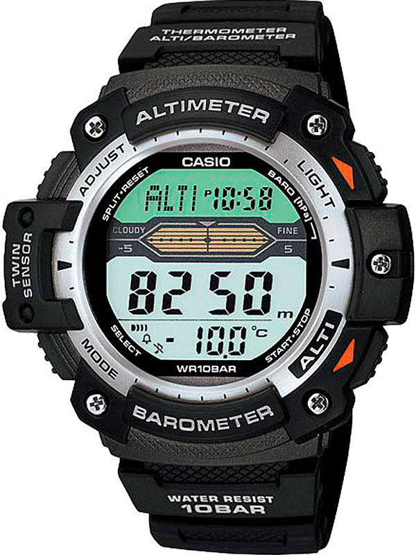 Электронные кварцевые мужские наручные часы Casio SGW-300H-1A с высотомером и барометром коллекции OutGear. Калибр механизма — 3202. Функциональность данной модели: высотомер (Altimeter), барометр, термометр, формат времени 12/24, функция летнего времени (DST), мировое время 48 городов (31 часовой пояс), автоматический календарь до 2099 года, 5 независимых будильников, сигнал начала часа, секундомер с точностью 1/100 секунды и измерением до 23 часа 59 минут 59,99 cек., таймер обратного отсчета (диапазон времени 24 часа), функция выключения звука кнопок (Mute), диодная подсветка циферблата. Водонепроницаемость WR100 (10 атм). Размеры корпуса: Диаметр 46 мм; толщина 13.2 мм Гарантийный срок — 3 года (1 год от производителя + 2 года от магазина).