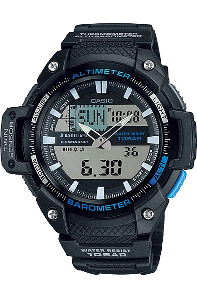 Кварцевые мужские наручные часы Casio SGW-450H-1A с высотомером и барометром коллекции OutGear. Калибр механизма — 5450. Функциональность данной модели: высотомер (Altimeter), барометр, термометр, формат времени 12/24, функция летнего времени (DST), мировое время 48 городов (31 часовой пояс), автоматический календарь до 2099 года, 5 независимых будильников, сигнал начала часа, секундомер с точностью 1/100 секунды и измерением до 23 часа 59 минут 59,99 cек., таймер обратного отсчета (диапазон времени 24 часа), функция выключения звука кнопок (Mute), электролюминесцентная подсветка циферблата. Стрелки покрыты люминесцентным напылением (светятся в темноте). Водонепроницаемость WR100 (10 атм).