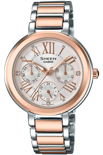 Женские кварцевые наручные часы Casio SHE-3034SPG-7A коллекции Sheen. Калибр механизма — 5420 На данной модели отображается дата, день недели и время суток (24-х часовая шкала). Циферблат украшен камнями Swarovski. Стрелки покрыты люминесцентным напылением (светятся в темноте). Водонепроницаемость WR50 (5 атм).