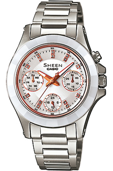 Женские кварцевые наручные часы с подсветкой Casio SHE-3503SG-7A коллекции Sheen. Калибр механизма — 5318. На данной модели отображается дата, день недели и время суток (24-х часовая шкала). Циферблат украшен камнями Swarovski. Яркая диодная подсветка циферблата. Стрелки покрыты люминесцентным напылением (светятся в темноте). Сапфировое стекло. Водонепроницаемость WR50 (5 атм).