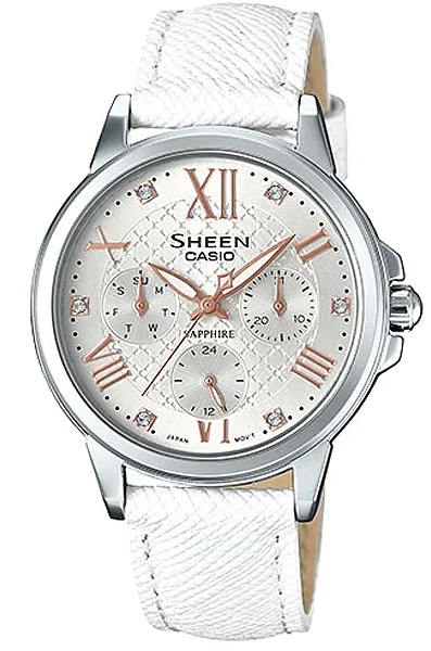 Женские кварцевые наручные часы Casio SHE-3511L-7A коллекции Sheen. Калибр механизма — 5420 На данной модели отображается дата, день недели и время суток (24-х часовая шкала). Циферблат украшен камнями Swarovski. Установлено сапфировое стекло устойчивое у царапинам. Стрелки покрыты люминесцентным напылением (светятся в темноте). Водонепроницаемость WR50 (5 атм).