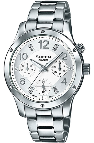 Женские кварцевые наручные часы с подсветкой Casio SHE-3807D-7A коллекции Sheen. Калибр механизма — 5456. На данной модели отображается дата, день недели и время суток (24-х часовая шкала). Циферблат украшен камнями Swarovski. Яркая диодная подсветка циферблата. Водонепроницаемость WR50 (5 атм).