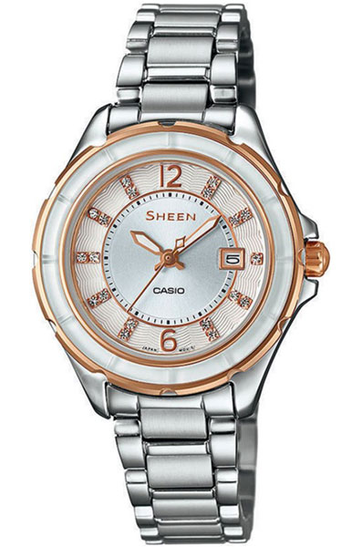 Женские кварцевые наручные часы Casio SHE-4045SG-7A коллекции Sheen. Калибр механизма — 2725. На данной модели отображается дата. Циферблат украшен камнями Swarovski. Стеклянный безель. Водонепроницаемость WR100 (10 атм).