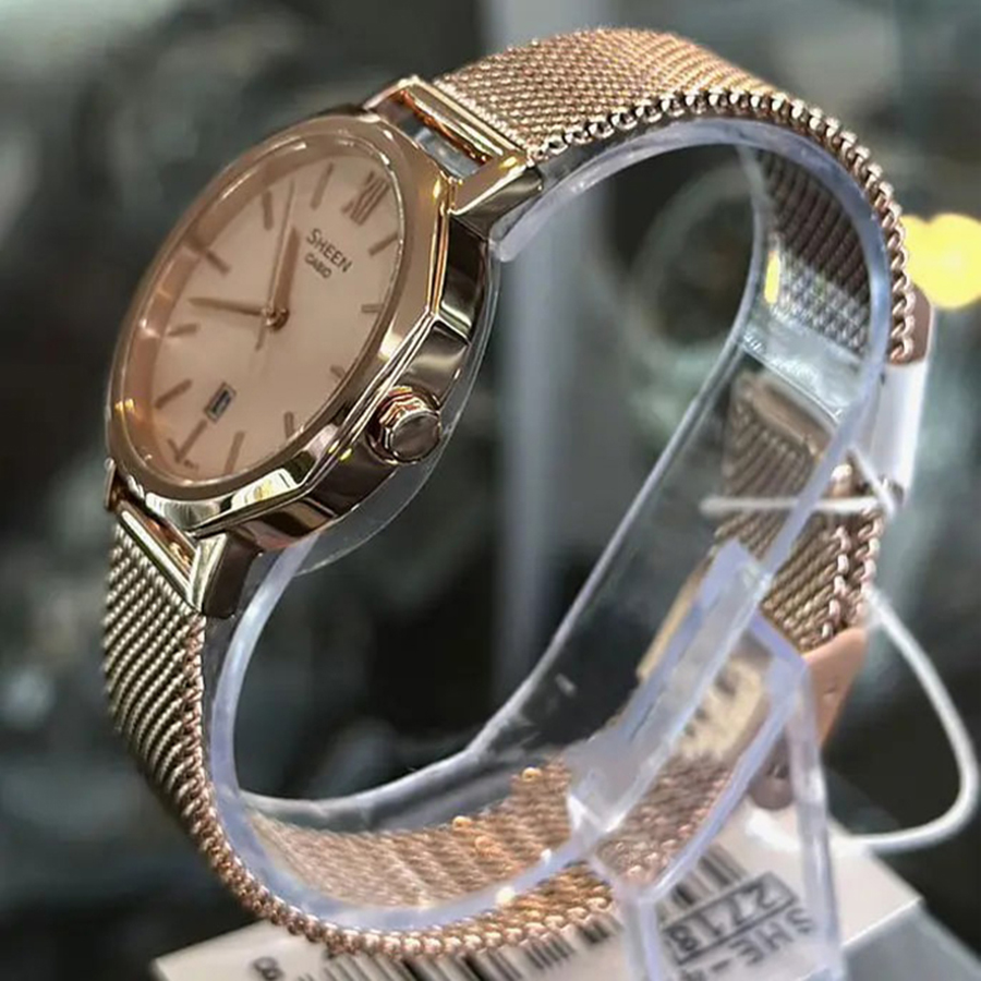 Женские кварцевые наручные часы Casio SHE-4554PGM-4A коллекции Sheen. Калибр механизма — 2718. На данной модели отображается дата. Сапфировое стекло. Стальной браслет миланского плетения. На корпус и браслет нанесено стойкое PVD покрытие. Водонепроницаемость WR50 (5 атм). Размеры корпуса: (ШxВxТ) 30x37x7.5 мм. Гарантийный срок — 3 года (1 год от производителя + 2 года от магазина).