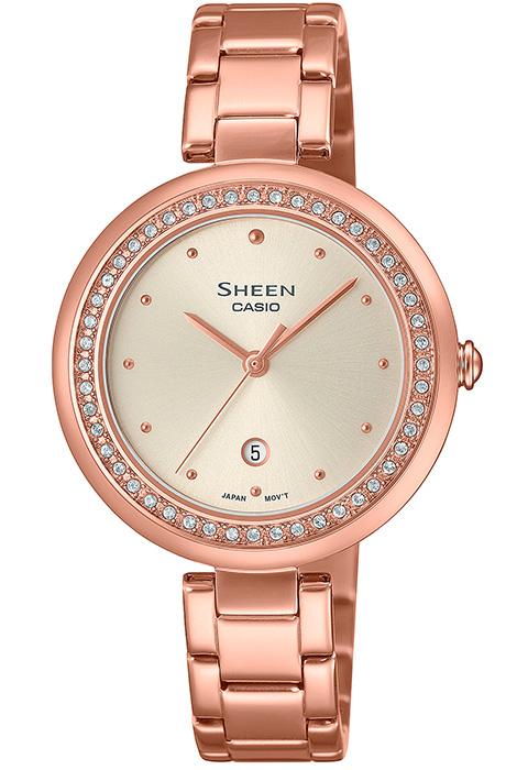 Женские кварцевые наручные часы Casio SHE-4556PG-7A коллекции Sheen. Калибр механизма — 2744. Тонкий корпус часов - всего 6.2 мм. На циферблате присутствует индикация текущей даты. Корпус украшен камнями Swarovski. Установлено сапфировое стекло устойчивое к царапинам. На корпус и браслет нанесено стойкое PVD покрытие. Водонепроницаемость WR50 (5 атм). Размеры корпуса: (ШхВхТ) 32x39x6.2 мм Гарантийный срок — 3 года (1 год от производителя + 2 года от магазина).