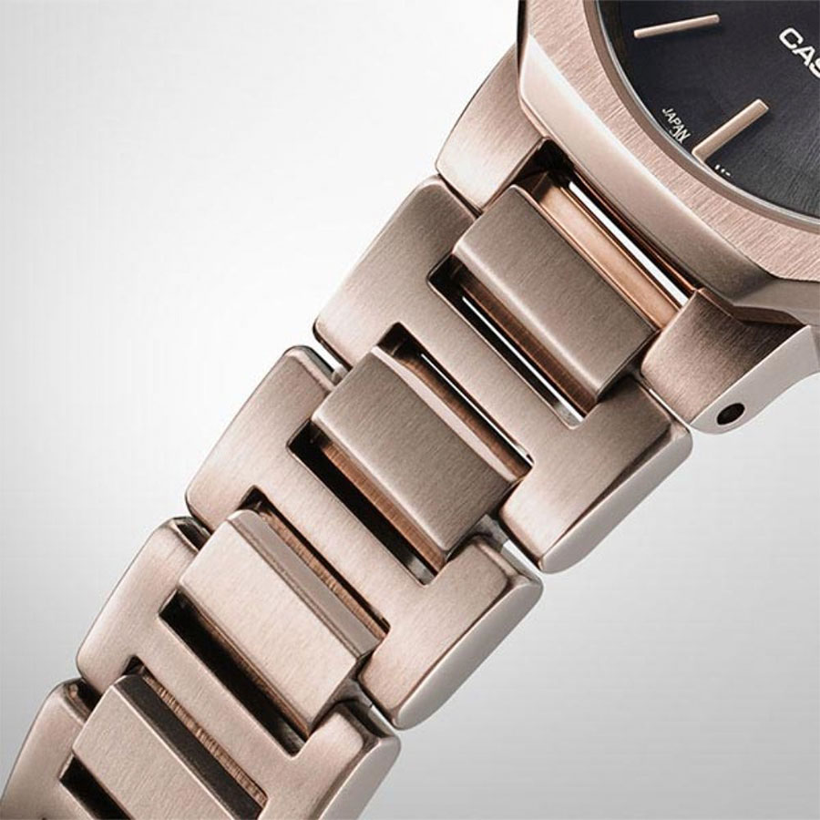 Корпус и браслет выполнены из нержавеющей стали и покрыты стойким PVD-составом, защищающим поверхность от истирания. Циферблат черного цвета дополнен сапфировым стеклом с антибликовым покрытием, устойчивым к царапинам. Элегантный металлический браслет гармонично завершает утонченный облик модели.