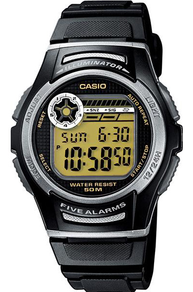Электронные кварцевые мужские наручные часы Casio W-213-9A с цифровой индикацией времени. Калибр механизма — 3170. Функциональность данной модели: формат времени 12/24, автоматический календарь до 2099 года, функция двойного времени, 5 многофункциональных независимых будильников, сигнал начала часа, секундомер с точностью 1/100 секунды и измерением до 23 часов 59 минут 59,99 cек., таймер обратного отсчета (диапазон времени 24 часа), диодная подсветка циферблата. Батарейка на 10 лет работы.
