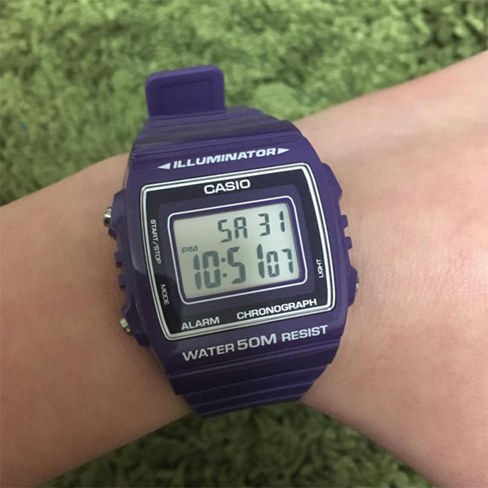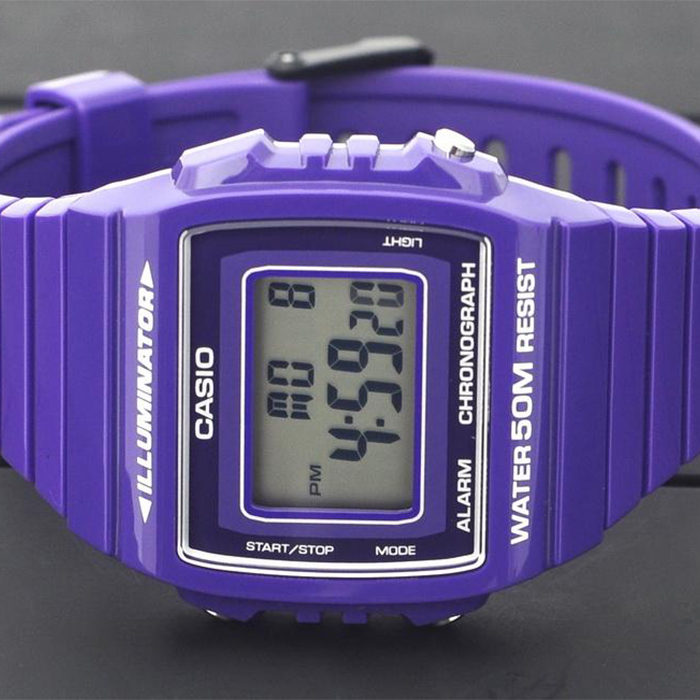 Электронные кварцевые наручные часы Casio W-215H-6A с цифровой индикацией времени. Калибр механизма — 3224. Функциональность данной модели: формат времени 12/24, автоматический календарь до 2099 года, будильник, сигнал начала часа, секундомер с точностью 1/100 секунды и измерением до 59 минут 59,99 cек., диодная подсветка циферблата. Водонепроницаемость WR50 (5 атм). Размеры корпуса: (ШxВxТ) 40.7x43.8x10.9 мм. Гарантийный срок — 3 года (1 год от производителя + 2 года от магазина).