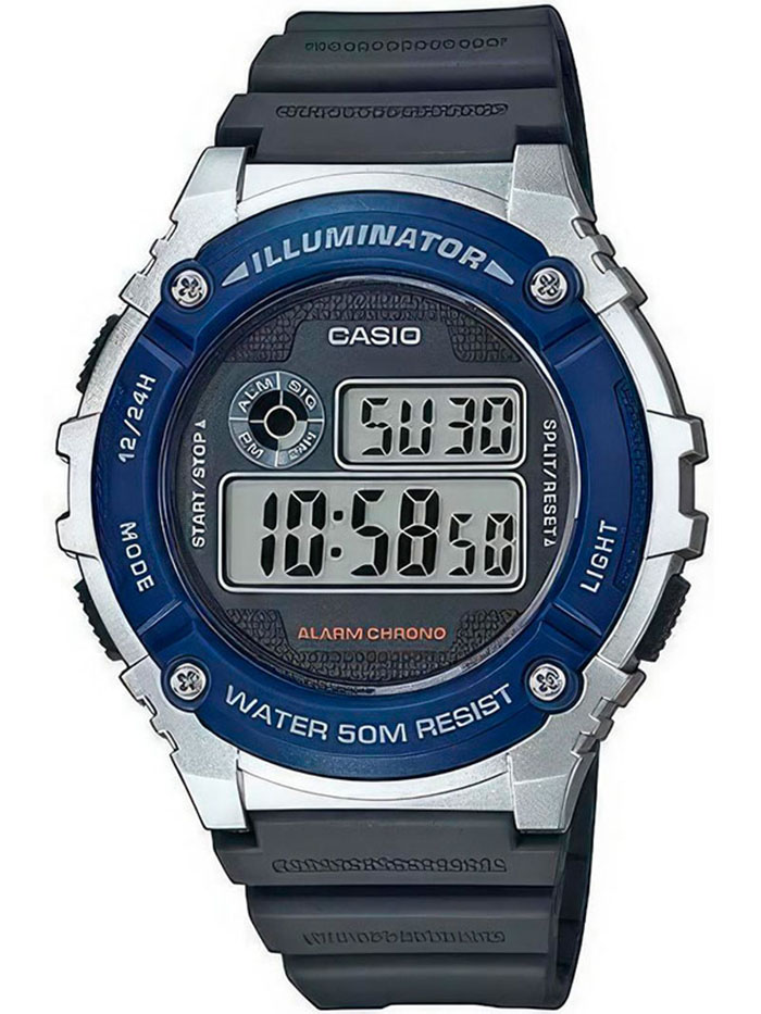 Электронные кварцевые мужские наручные часы Casio W-216H-2A с цифровой индикацией времени. Калибр механизма — 3435. Функциональность данной модели: формат времени 12/24, автоматический календарь с установкой 28 дней на февраль, будильник, сигнал начала часа, секундомер с точностью 1/100 секунды и измерением до 59 минут 59,99 cек., диодная подсветка циферблата. Водонепроницаемость WR50 (5 атм). Размеры корпуса: (ШxВxТ) 43.8x46x11.3 мм. Гарантийный срок — 3 года (1 год от производителя + 2 года от магазина).