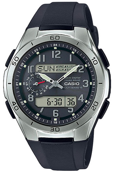 Мужские наручные часы на солнечной батарее Casio WVA-M650-1A2 с радиоконтролем. Калибр механизма — 5110. Функциональность данной модели: режим сохранения энергии, индикатор заряда батареи, радиоконтроль точного времени (Wave Ceptor), функция летнего времени (DST), мировое время 48 городов (29 часовых поясов), автоматический календарь до 2099 года (индикация даты и дня недели), 5 независимых будильников, сигнал начала часа, секундомер с измерением до 23 часов 59 минут 59.99 cек., таймер обратного отсчета (диапазон времени 60 минут), полностью автоматическая светодиодная подсветка (автоматически включается только в темноте) и люминесцентное напыление на стрелках.