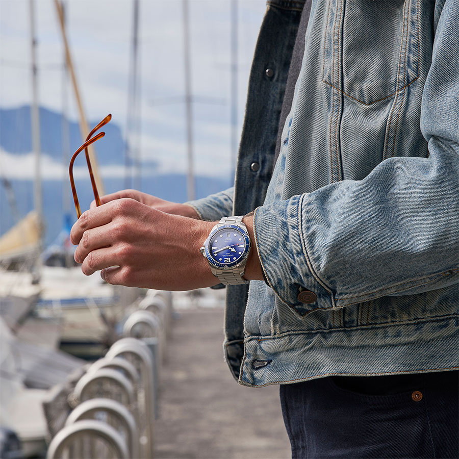 Циферблат глубокого синего цвета с выразительной текстурой защищён сапфировым стеклом с антибликовым покрытием, устойчивым к царапинам. Люминесцентные стрелки и метки с покрытием Super-LumiNova обеспечивают превосходную читаемость даже в темноте.