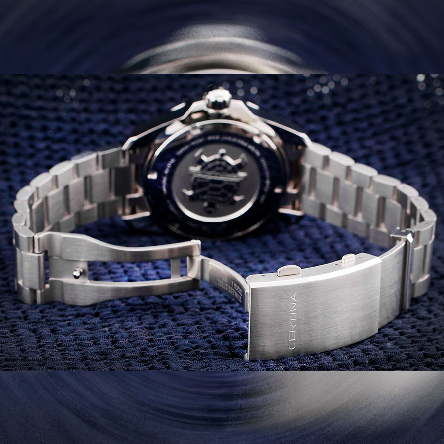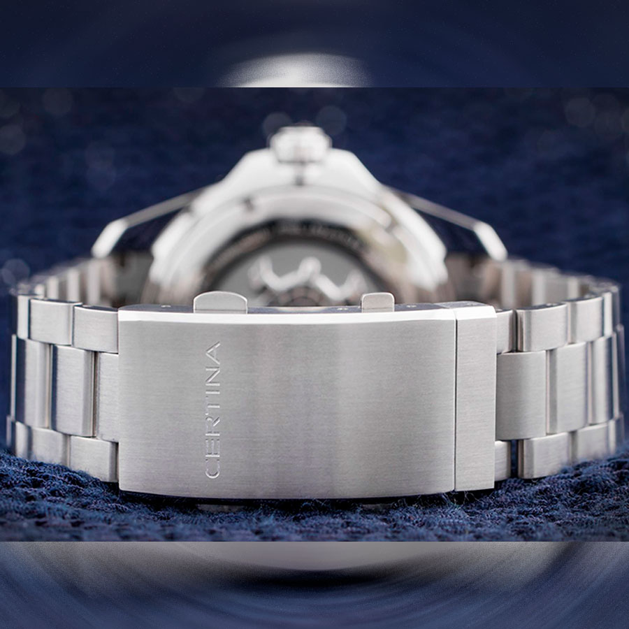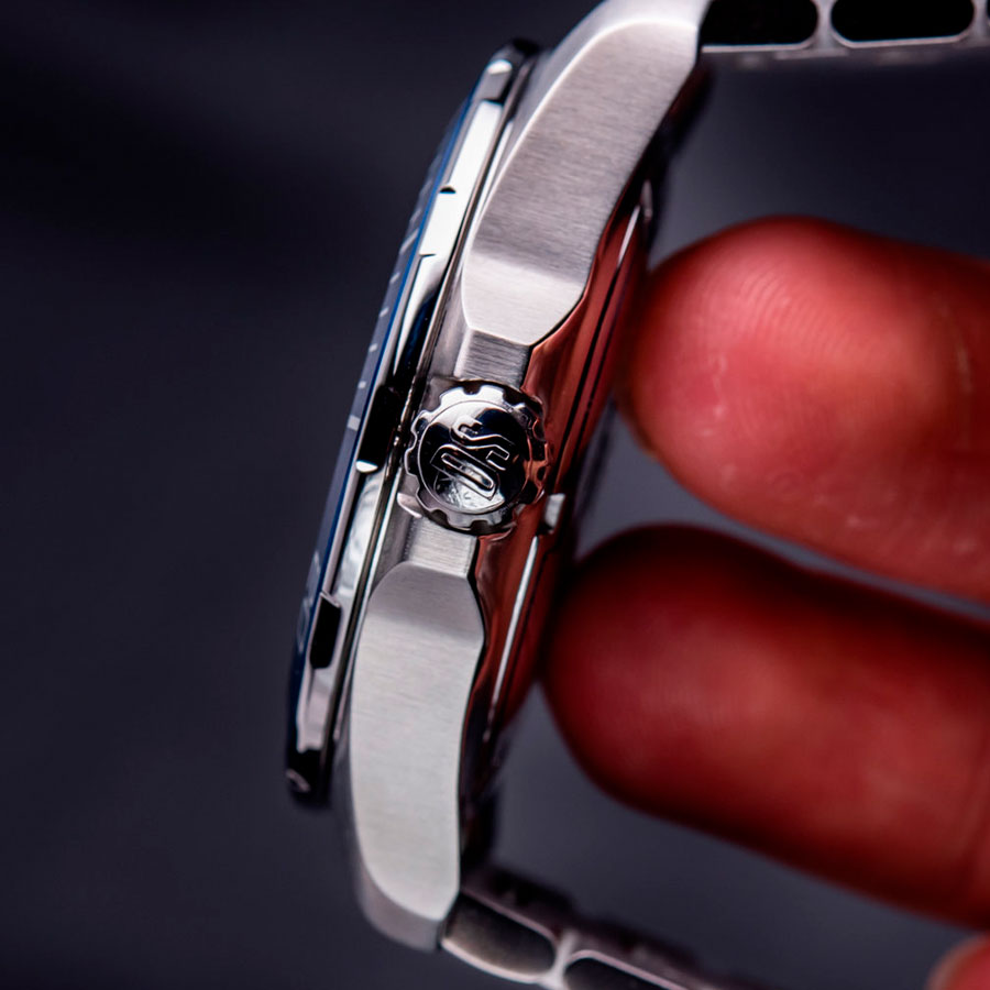 Корпус и литой браслет выполнены из нержавеющей стали, придавая часам прочность и премиальный блеск. Застёжка-клипса имеет функцию быстрого удлинения — удобно при ношении часов поверх гидрокостюма. Завинчивающиеся задняя крышка и заводная головка обеспечивают дополнительную защиту от влаги. На корпус частично нанесено стойкое PVD покрытие.