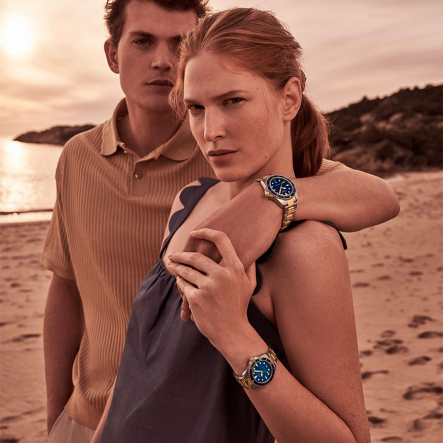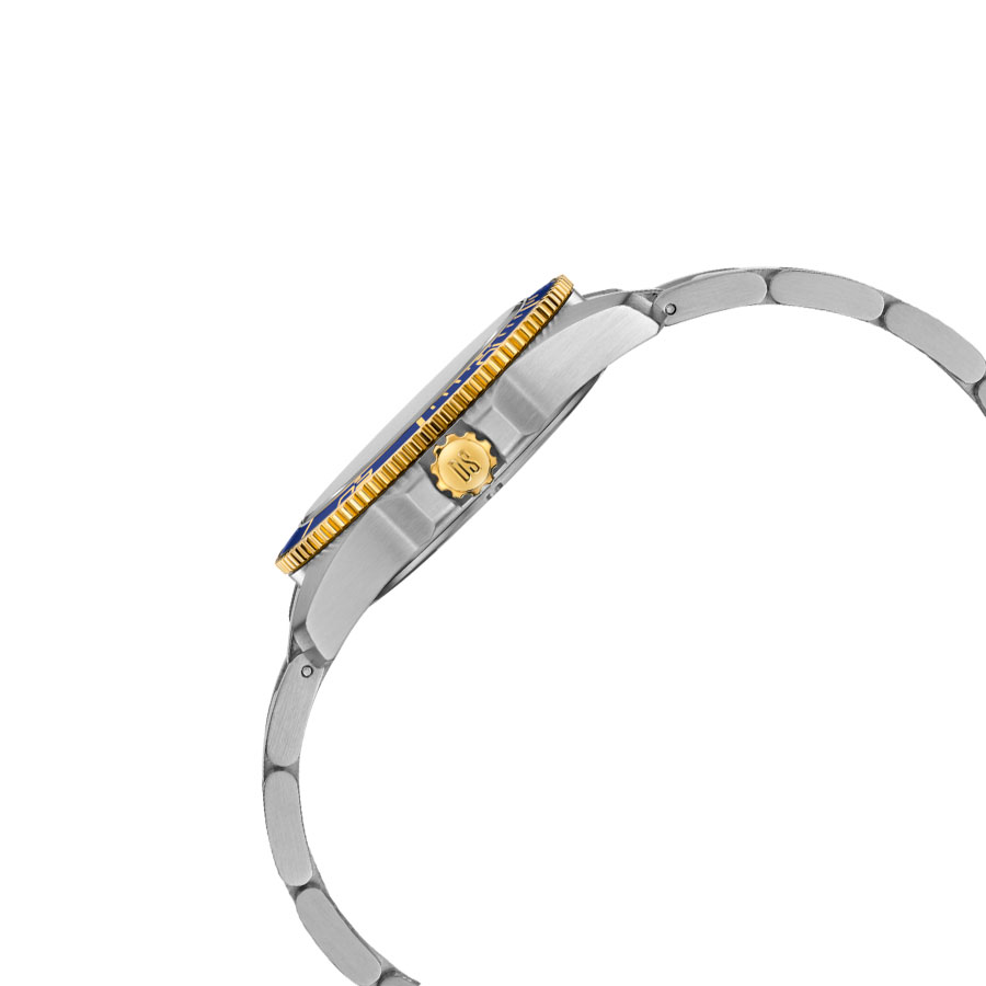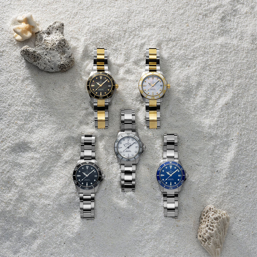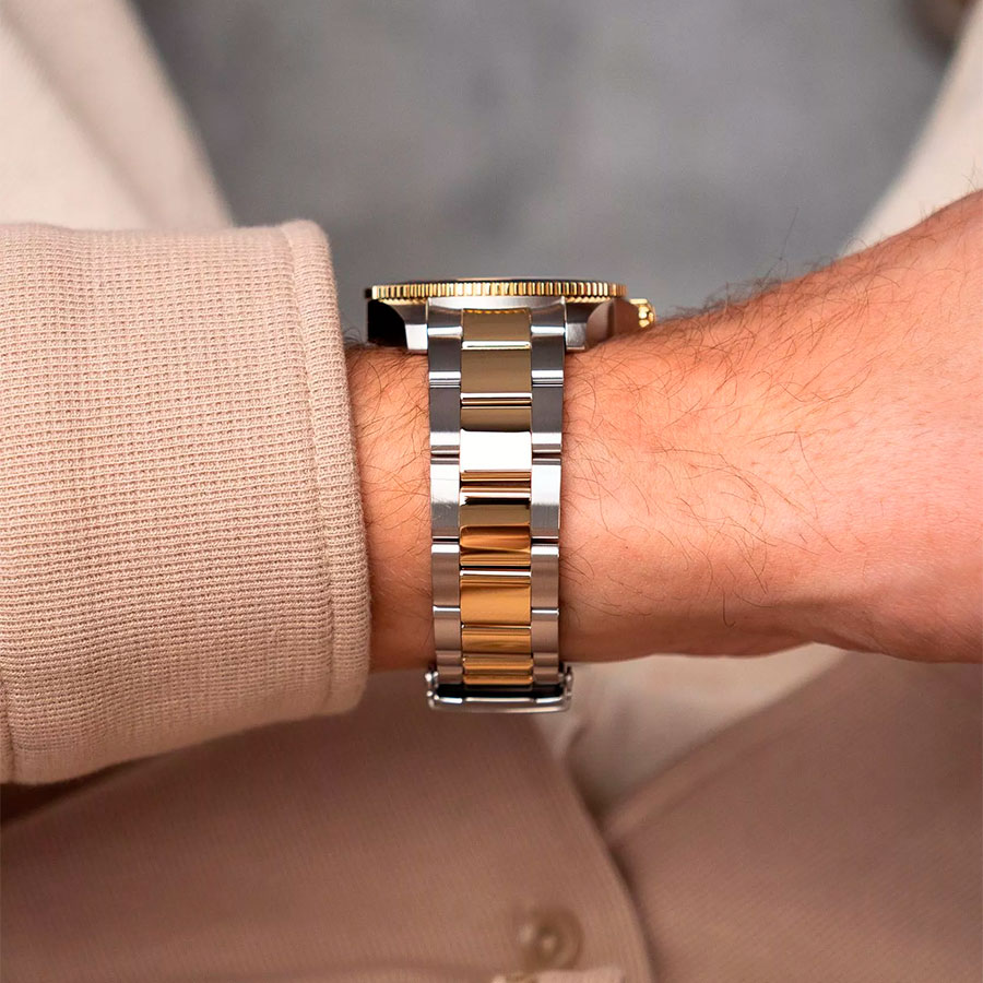 Корпус и браслет выполнены из нержавеющей стали с частичным PVD покрытием, придающим модели элегантный контраст и долговечность. Однонаправленно вращающийся безель подчёркивает спортивный характер часов и удобен для контроля времени при погружениях.