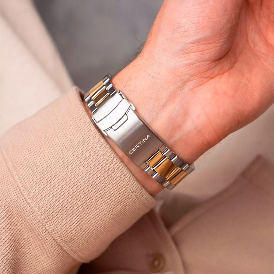 В основе часов лежит высокоточный кварцевый калибр ETA F06.412 (Swiss Made) с запатентованной технологией Certina Precidrive, обеспечивающей точность до ±10 секунд в год — почти в десять раз выше, чем у обычных кварцевых механизмов. Функции индикации даты и индикатора окончания срока службы батареи делают модель удобной и практичной.