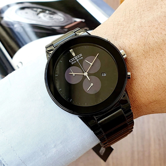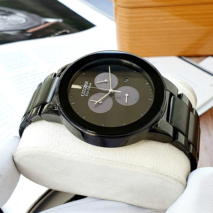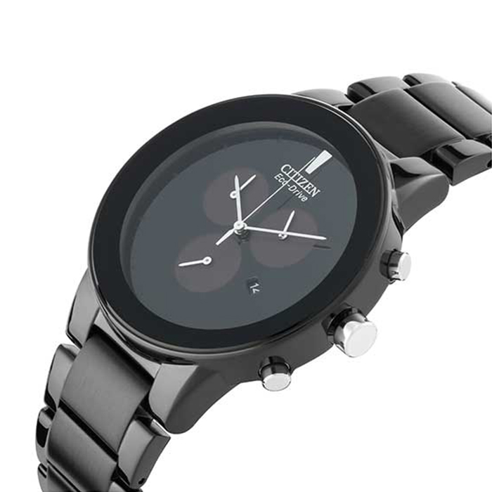 Мужские кварцевые наручные часы с хронографом (секундомером) на солнечной батарее Citizen Axiom AT2245-57E коллекции Eco-Drive Chrono. Калибр механизма — H504. Аккумулятор данной модели заряжается от любого источника света. Срок работы аккумулятора с полным зарядом — около 6-ти месяцев. Примерный срок службы аккумулятора — 10 лет. Присутствует функция информирования о недостаточном заряде. На данной модели отображается дата и время суток (24-х часовая шкала). Секундомер может отсчитывать до 60 минут. На корпус и браслет нанесено стойкое PVD покрытие. Водонепроницаемость WR (3 атм).