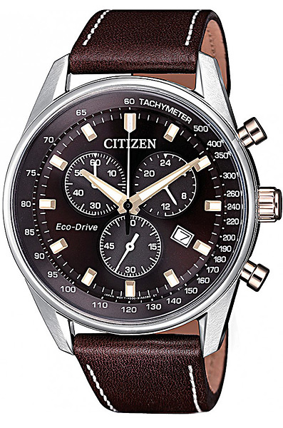 Мужские кварцевые наручные часы с хронографом (секундомером) на солнечной батарее Citizen AT2396-19X коллекции Eco-Drive Chrono. Калибр механизма — H500. Аккумулятор данной модели заряжается от любого источника света. Срок работы аккумулятора с полным зарядом — около 6-ти месяцев. Примерный срок службы аккумулятора — 10 лет. Присутствует функция информирования о недостаточном заряде. На данной модели отображается дата и время суток (24-х часовая шкала). Секундомер может отсчитывать до 60 минут, так же на циферблате часов присутствует шкала тахиметра для измерения средней скорости движения. Стрелки покрыты люминесцентным напылением (светятся в темноте). Ремешок — телячья кожа. Водонепроницаемость WR100 (10 атм). Завинчивающаяся задняя крышка.