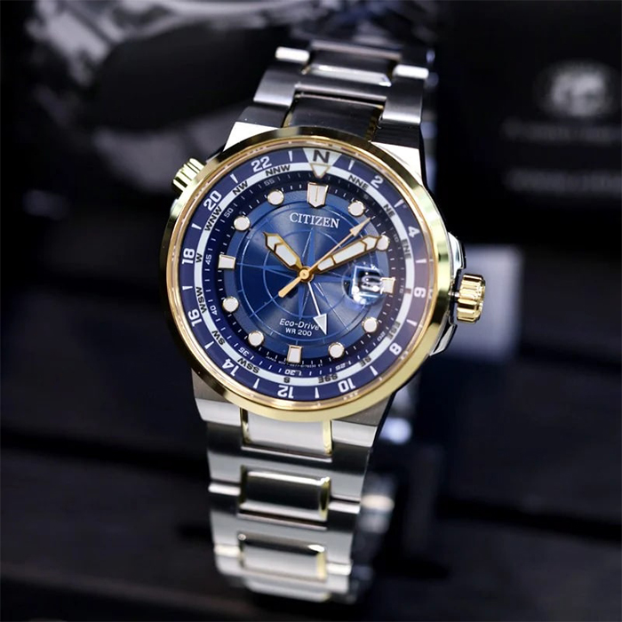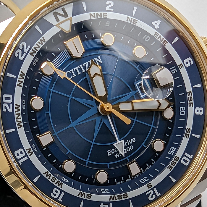 Мужские кварцевые наручные часы на солнечной батарее Citizen BJ7144-52L коллекции Eco-Drive. Калибр механизма — B877. Аккумулятор данной модели заряжается от любого источника света. Срок работы аккумулятора с полным зарядом — около 6-ти месяцев. Примерный срок службы аккумулятора — 10 лет. Присутствует функция информирования о недостаточном заряде и функция защиты от перезаряда. На данной модели отображается дата. Внутренний вращающийся безель со шкалой солнечного компаса (Азимут). Функция GMT - второй часовой пояс (двойное время). Данная модель обладает высокой степенью водонепроницаемости WR200 (20 атм) и подходит для глубокого погружения под воду. Устойчивое к появлению царапин сапфировое стекло с антибликовым покрытием. Завинчивающаяся задняя крышка. Стрелки и метки покрыты люминесцентным напылением (светятся в темноте). На корпус и браслет частично нанесено стойкое PVD покрытие.