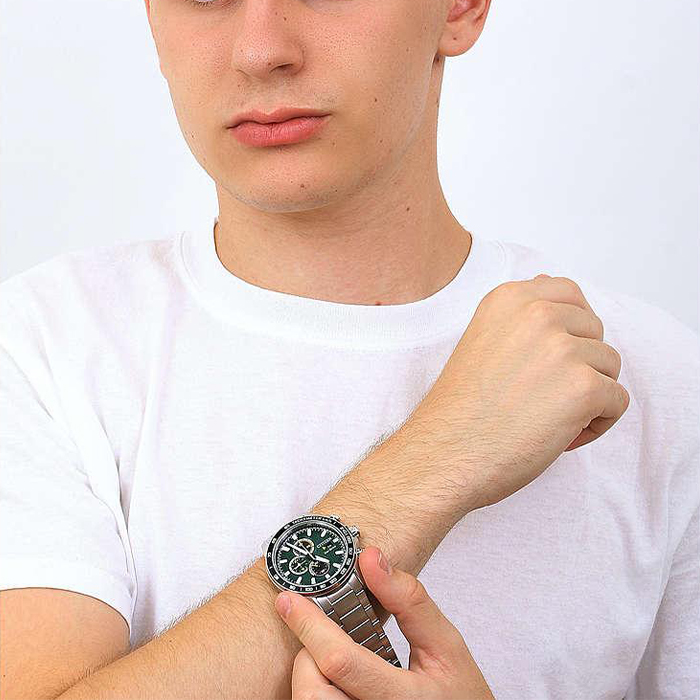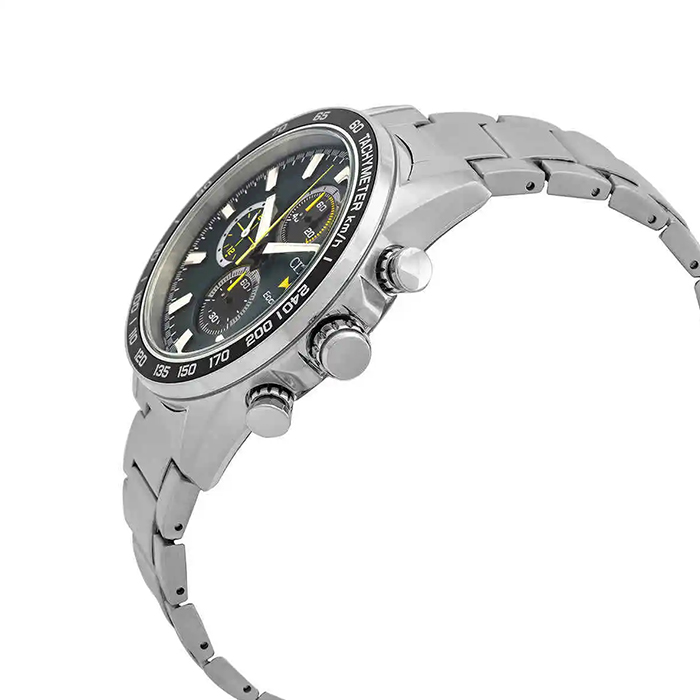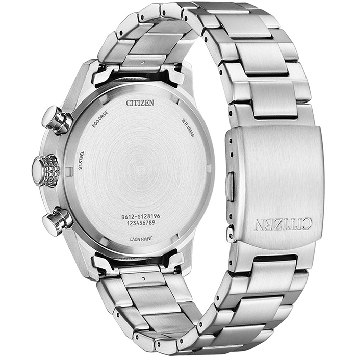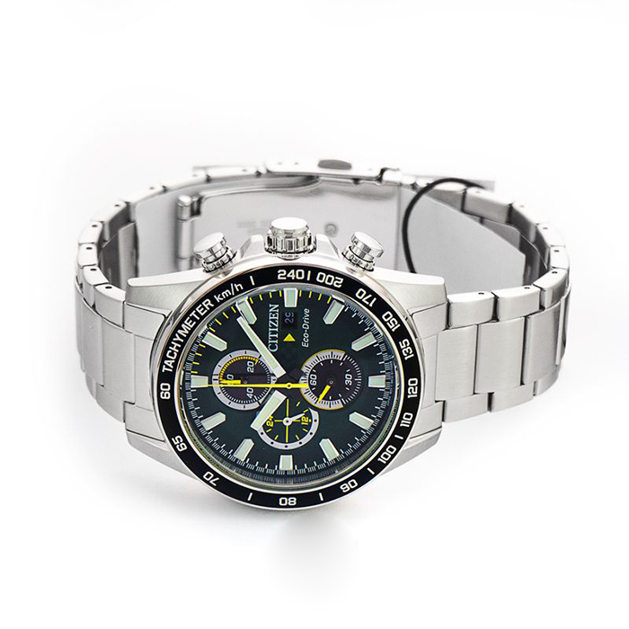Мужские кварцевые часы с хронографом (секундомером) Citizen CA0780-87X коллекции Eco-Drive Chrono. Калибр механизма — B612. Аккумулятор данной модели заряжается от любого источника света. Срок работы аккумулятора с полным зарядом — 210 дней. Примерный срок службы аккумулятора — 10 лет. Присутствует функция информирования о недостаточном заряде. На данной модели отображается дата и время суток (24-х часовая шкала). Секундомер может отсчитывать до 59 минут 59 сек. с точностью 1/5 секунды. На безеле присутсвует шкала тахиметра для измерения средней скорости движения. Стрелки и метки покрыты люминесцентным напылением (светятся в темноте). Завинчивающаяся задняя крышка. На корпус частично нанесено стойкое PVD покрытие. Водонепроницаемость WR100 (10 атм).