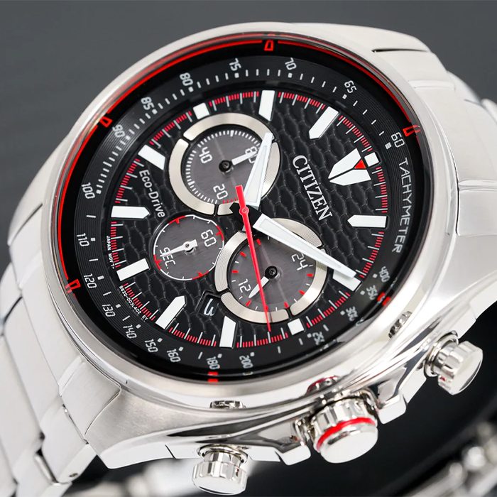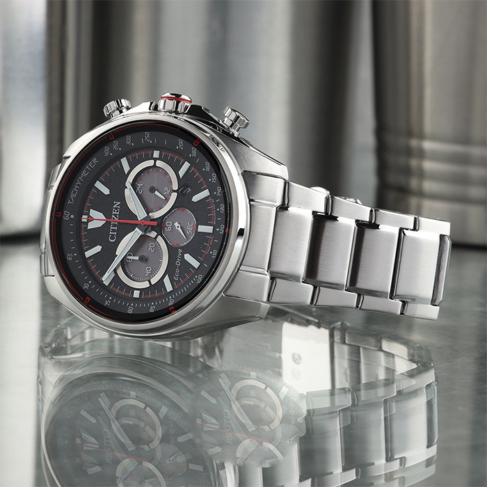 Мужские кварцевые часы с хронографом (секундомером) Citizen CA4561-89E коллекции Eco-Drive Chrono. Калибр механизма — B620. Аккумулятор данной модели заряжается от любого источника света. Срок работы аккумулятора с полным зарядом — 270 дней. Примерный срок службы аккумулятора — 10 лет. Присутствует функция информирования о недостаточном заряде. На данной модели отображается дата и время суток (24-х часовая шкала). Секундомер может отсчитывать до 60 минут с точностью 1/5 секунды. Стрелки и метки покрыты люминесцентным напылением (светятся в темноте). На циферблате присутсвует шкала тахиметра для измерения средней скорости движения. Стальной браслет. Завинчивающаяся задняя крышка. Водонепроницаемость WR100 (10 атм).