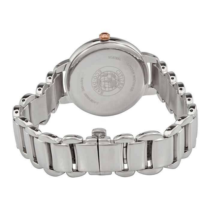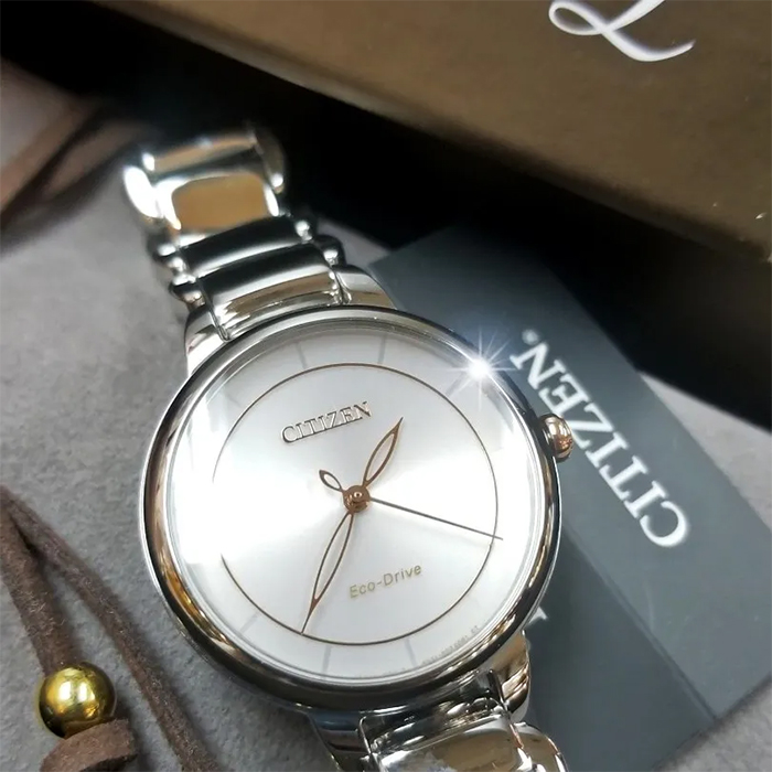 Женские кварцевые часы на солнечной батарее Citizen EM0676-85X коллекции Eco-Drive. Калибр механизма — E031. Аккумулятор данной модели заряжается от любого источника света. Срок работы аккумулятора с полным зарядом — до 180 дней. Примерный срок службы аккумулятора — 10 лет. Имеется функция предупреждения о недостаточном заряде и функция предотвращения перезаряда. Установлено устойчивое к царапинам сапфировое стекло. Стальной браслет. Водонепроницаемость WR50 (5 атм).