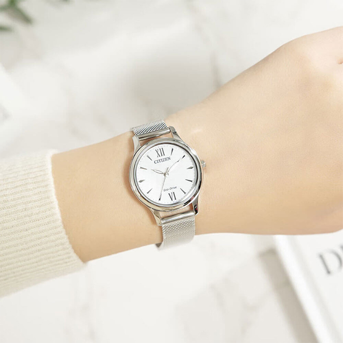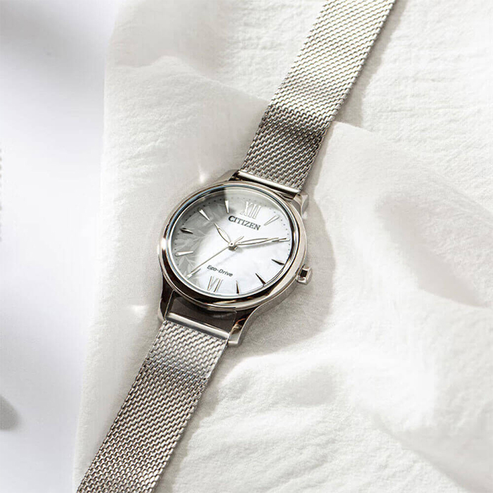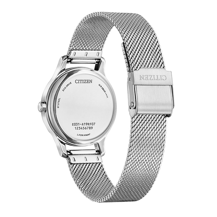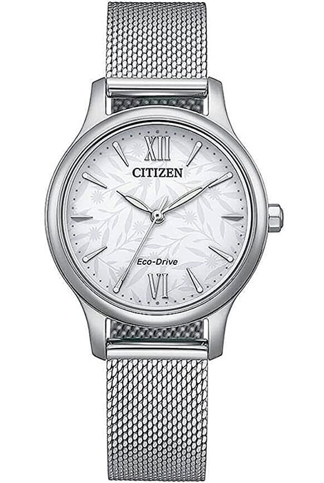 Женские кварцевые часы на солнечной батарее Citizen EM0899-81A коллекции Eco-Drive. Калибр механизма — E031. Аккумулятор данной модели заряжается от любого источника света. Срок работы аккумулятора с полным зарядом — до 180 дней. Примерный срок службы аккумулятора — 10 лет. Имеется функция предупреждения о недостаточном заряде и функция предотвращения перезаряда. Стрелки и метки покрыты люминесцентным напылением (светятся в темноте). Стальной браслет миланского плетения. Водонепроницаемость WR50 (5 атм).
