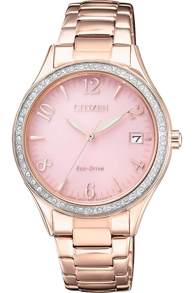 Женские кварцевые часы на солнечной батарее Citizen EO1183-84X коллекции Eco-Drive. Калибр механизма — E111. Аккумулятор данной модели заряжается от любого источника света. Срок работы аккумулятора с полным зарядом — 180 дней. Примерный срок службы аккумулятора — 10 лет. На данной модели отображается текущая дата. Стрелки покрыты люминесцентным напылением (светятся в темноте). Корпус украшен кристаллами Swarovski. На корпус и браслет нанесено стойкое PVD покрытие. Водонепроницаемость WR50 (5 атм).