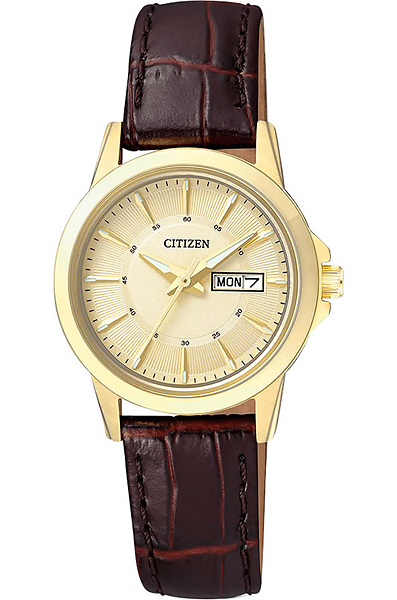 Женские наручные кварцевые часы Citizen EQ0603-08PE. Калибр механизма — 1002. На данной модели отображается дата и день недели. Стрелки и метки покрыты люминесцентным напылением (светятся в темноте). Ремешок — телячья кожа. На корпус нанесено стойкое PVD покрытие.