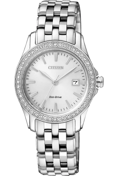 Женские кварцевые наручные часы на солнечной батарее Citizen EW1901-58A коллекции Eco-Drive. Калибр механизма — E011. Аккумулятор данной модели заряжается от любого источника света. Срок работы аккумулятора с полным зарядом — около 6-ти месяцев. Примерный срок службы аккумулятора — 10 лет. Присутствует функция информирования о недостаточном заряде. На данной модели отображается дата. Корпус украшен кристаллами Swarovski. Водонепроницаемость WR100 (10 атм). Завинчивающаяся задняя крышка.