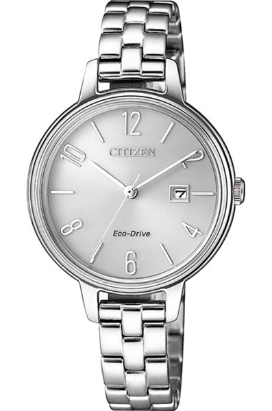 Женские кварцевые наручные часы на солнечной батарее Citizen EW2440-88A коллекции Eco-Drive. Калибр механизма — E011. Аккумулятор данной модели заряжается от любого источника света. Срок работы аккумулятора с полным зарядом — около 6-ти месяцев. Примерный срок службы аккумулятора — 10 лет. Присутствует функция информирования о недостаточном заряде. На данной модели отображается дата. Водонепроницаемость WR50 (5 атм).