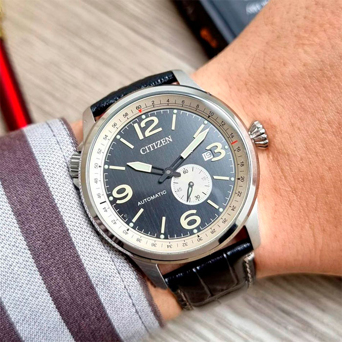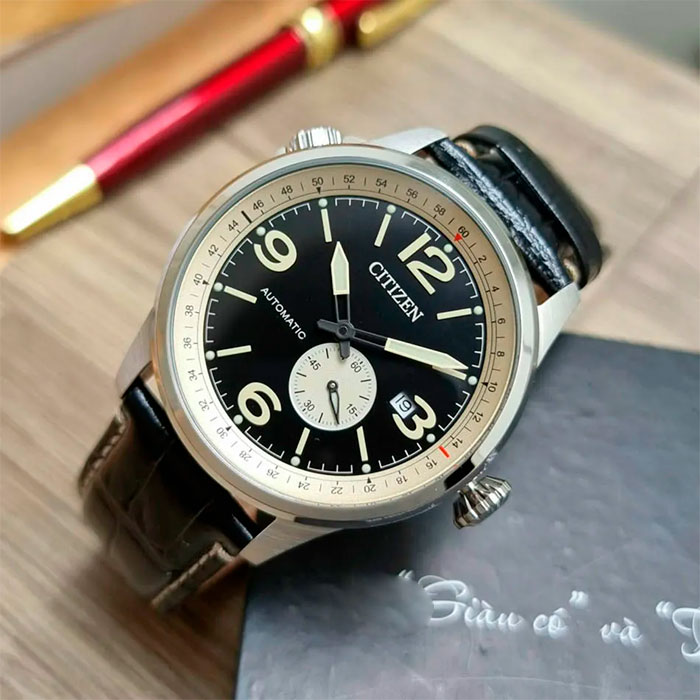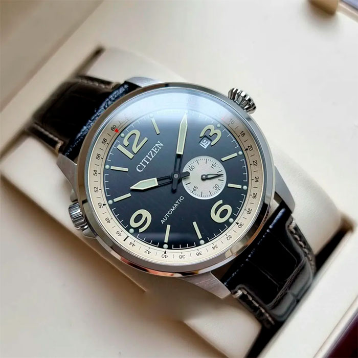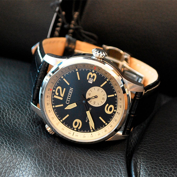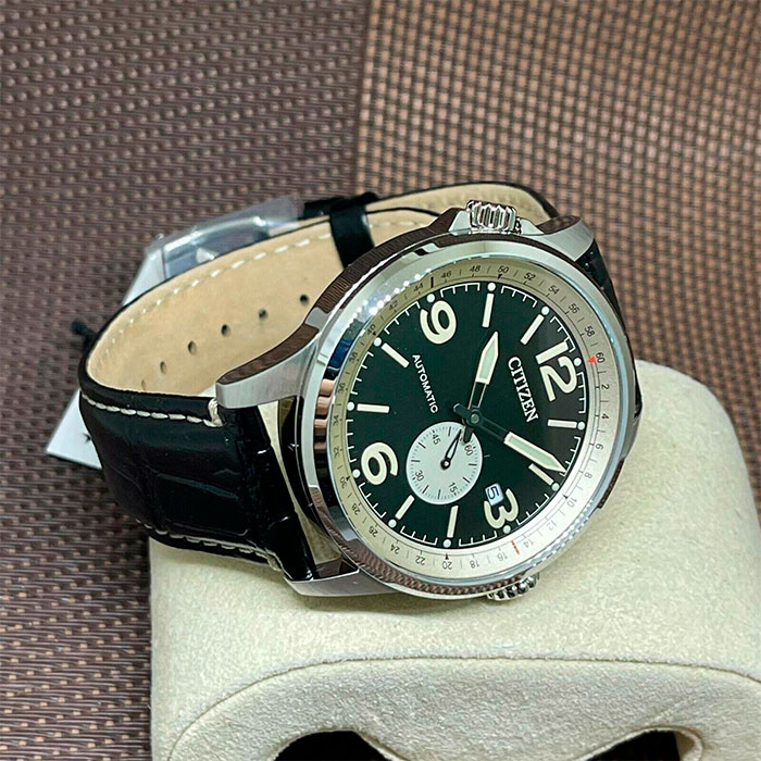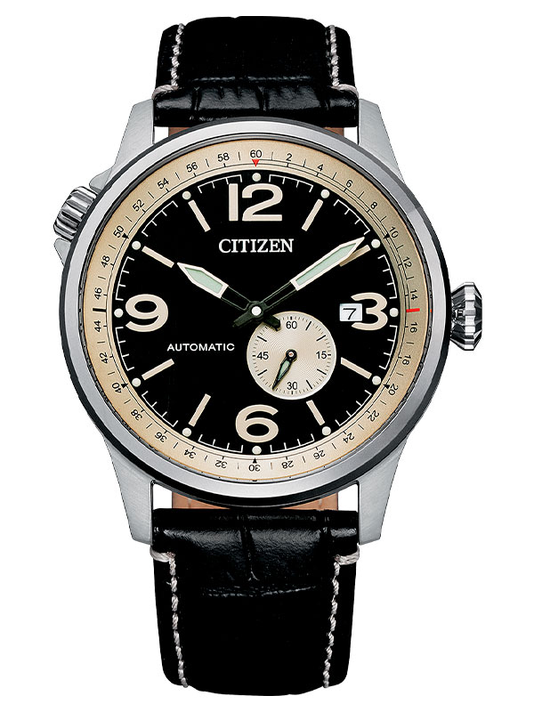Мужские механические наручные часы с автоподзаводом и возможностью ручного завода Citizen NJ0140-17E коллекции Automatic. Калибр механизма — 8213. Запас хода не менее 40-ка часов. Количество камней - 21. На данной модели отображается текущая дата. Секундная стрелка вынесена на отдельный циферблат. Внутренний вращающийся безель. Прозрачная завинчивающаяся задняя крышка. Кожаный ремешок. Стрелки и метки покрыты люминесцентным напылением (светятся в темноте). Водонепроницаемость WR100 (10 атм).