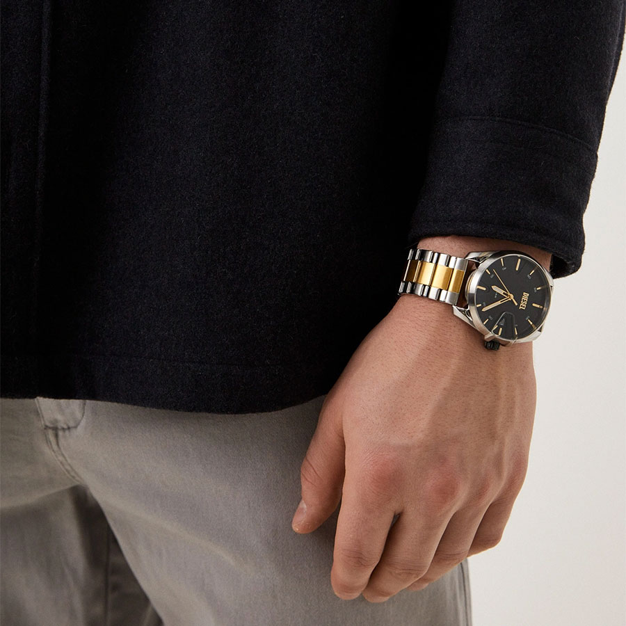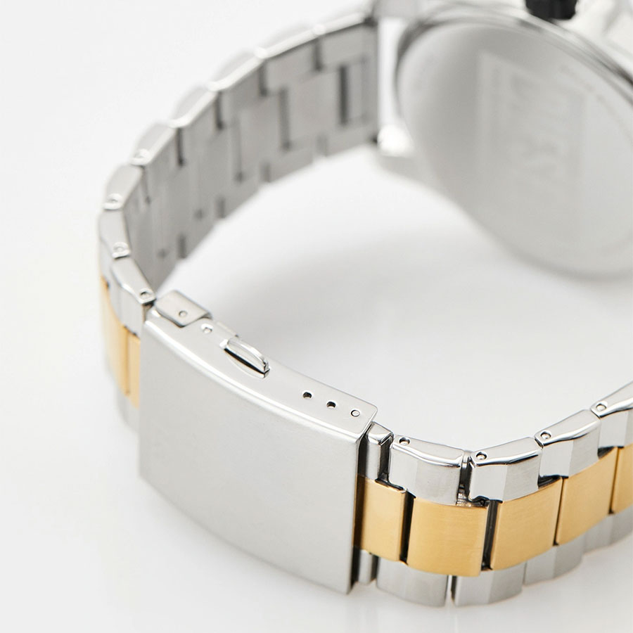 Корпус и браслет выполнены из прочной стали с частичным PVD покрытием, придающим часам эффектный внешний вид и повышающим их износостойкость. Циферблат защищён минеральным стеклом, устойчивым к царапинам и внешним воздействиям. На циферблате отображается дата для удобства использования.