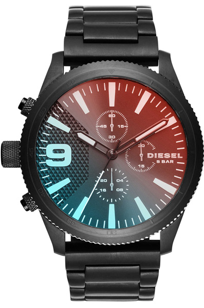 Мужские кварцевые наручные часы с хронографом (секундомером) Diesel DZ4447. На данной модели отображается дата и время суток (24-х часовая шкала). Секундомер может отсчитывать до 30 минут. Заводная головка и кнопки запуска/остановки секундомера расположены с левой стороны корпуса. На корпус и браслет нанесено стойкое PVD покрытие. Водонепроницаемость WR50 (5 атм).