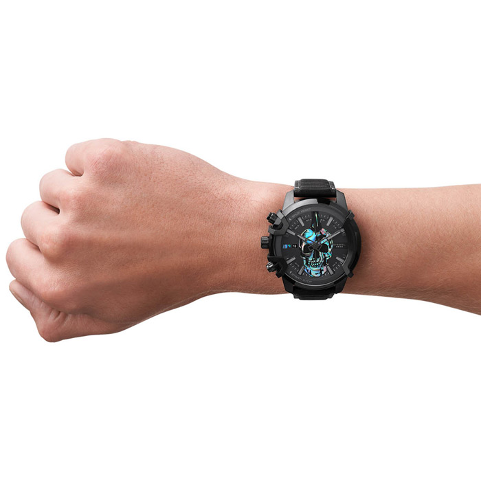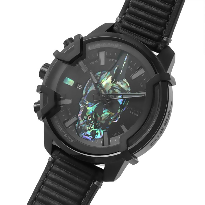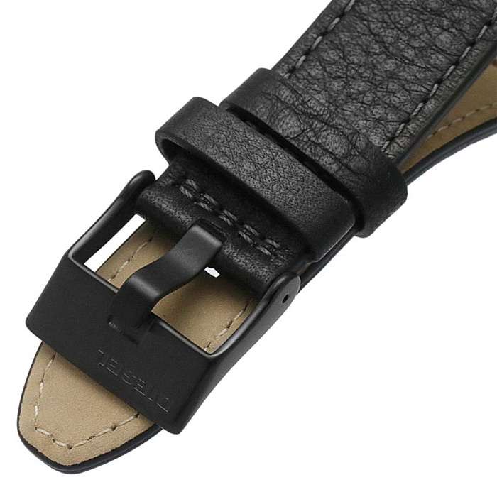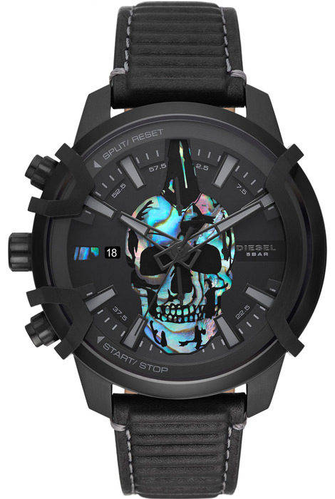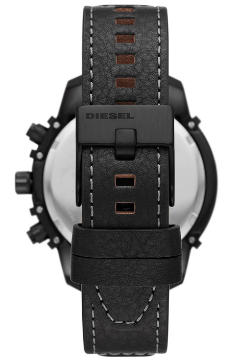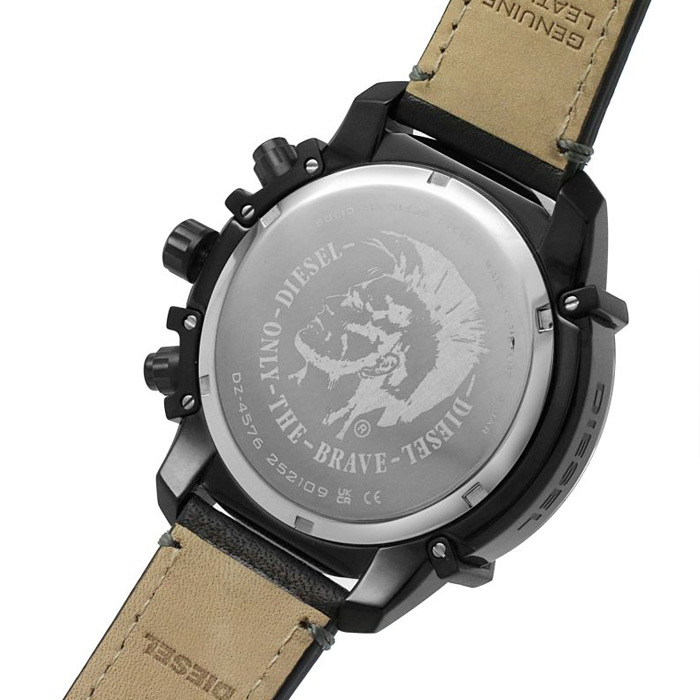 Мужские кварцевые наручные часы с хронографом (секундомером) Diesel DZ4576 коллекции Griffed. На данной модели отображается дата и время суток в 24-х часовом формате. Секундомер может отсчитывать до 60 минут с точностью 1/10 секунды. Кожаный ремешок. На корпус нанесено стойкое PVD покрытие. Водонепроницаемость WR50 (5 атм).