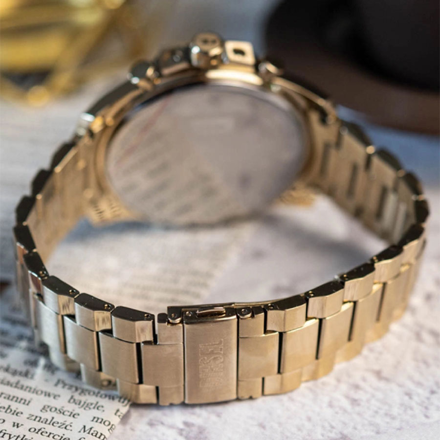Корпус и браслет выполнены из нержавеющей стали с прочным PVD покрытием, обеспечивающим стойкость к царапинам и долговечность. Стальной браслет надёжно фиксирует часы на руке, а минеральное стекло защищает циферблат от повреждений, сохраняя привлекательный внешний вид.