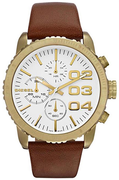 Мужские кварцевые наручные часы с хронографом (секундомером) Diesel DZ5328. На данной модели имеется шкала времени суток (24-х часовая шкала). Секундомер может отсчитывать до 30 минут. Стрелки покрыты люминесцентным напылением (светятся в темноте). Водонепроницаемость WR100 (10 атм).