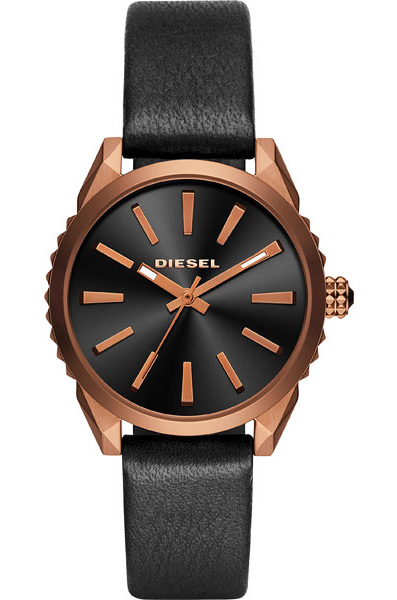 Женские кварцевые наручные часы Diesel DZ5559. Кожаный ремешок. Стрелки покрыты люминесцентным напылением (светятся в темноте). На корпус нанесено стойкое PVD покрытие. Водонепроницаемость WR50 (5 атм).