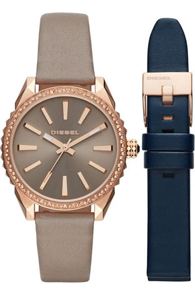 Женские кварцевые наручные часы Diesel DZ5563. Кожаный ремешок. Стрелки покрыты люминесцентным напылением (светятся в темноте). Часы комплектуются дополнительным ремешком. На корпус нанесено стойкое PVD покрытие. Водонепроницаемость WR50 (5 атм).