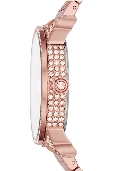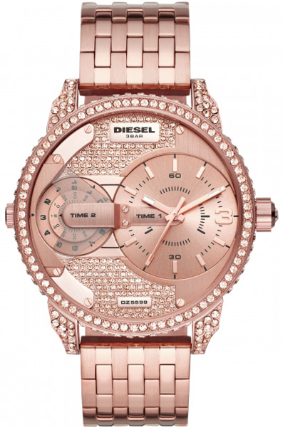 Женские кварцевые наручные часы Diesel DZ5597. Данная модель имеет 2 независимых циферблата. На корпус и браслет нанесено стойкое PVD покрытие. Корпус украшен кристаллами.