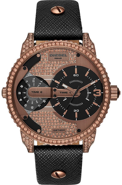Женские кварцевые наручные часы Diesel DZ7404. Данная модель имеет 2 независимых циферблата. Кожаный ремешок. На корпус и браслет нанесено стойкое PVD покрытие.