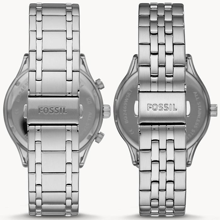 Кварцевые наручные часы с секундомером Fossil BQ2469SET коллекции Fenmore. Набор из парных моделей (мужские и женские) часов станет идеальным вариантом для совместного подарка. На данной модели отображается дата, день недели и время суток (24-х часовая шкала). Секундомер может отсчитывать до 60 секунд. Стальной браслет. Водонепроницаемость WR50 (5 атм).