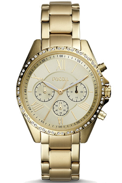 Женские кварцевые наручные часы с хронографом (секундомером) Fossil BQ3378 коллекции Modern Courier. На данной модели отображается время суток (24-х часовая шкала). Секундомер может отсчитывать до 30 минут. Стрелки покрыты люминесцентным напылением (светятся в темноте). Корпус украшен кристаллами. На корпус и браслет нанесено стойкое PVD покрытие. Стальной браслет. Водонепроницаемость WR50 (5 атм).