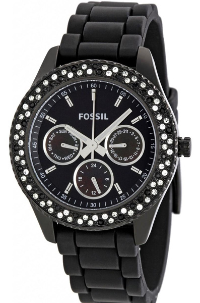 Женские кварцевые наручные часы Fossil ES2896. На данной модели отображается дата, день недели и время суток (24-х часовая шкала). Корпус украшен камнями. Стрелки покрыты люминесцентным напылением (светятся в темноте). Водонепроницаемость WR50 (5 атм).