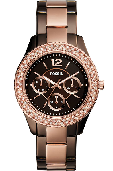 Женские кварцевые наручные часы Fossil ES4079. На данной модели отображается дата, день недели и время суток (24-х часовая шкала). Корпус украшен камнями. На корпус и браслет нанесено стойкое PVD покрытие. Водонепроницаемость WR50 (5 атм).